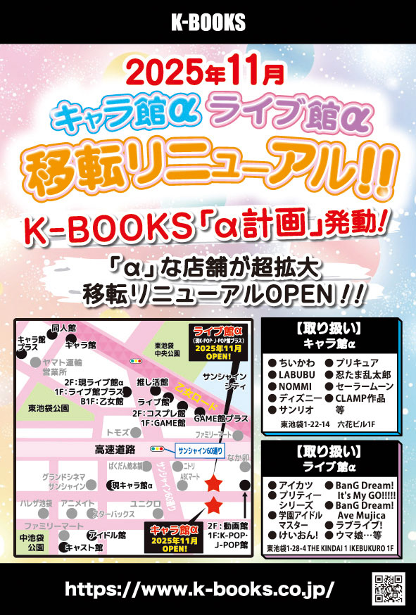 2025年11月 K-BOOKS「α計画」発動! 「キャラ館α」「ライブ館α」2店舗が移転リニューアルします! 「キャラ館α」は増床&1フロアで商品が見やすく! 「ライブ館α」は駅チカエリアに進出!