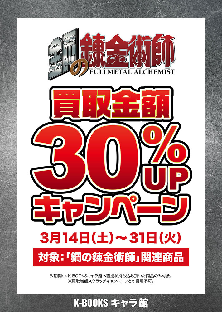 期間中、K-BOOKS キャラ館にて「鋼の錬金術師」の商品をお持込みの場合、対象商品の買取金額を30%UPさせていただきます。