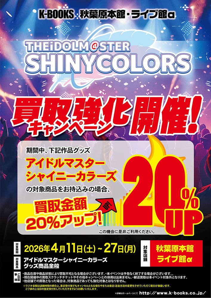 期間中、対象店舗へ「アイドルマスターシャイニーカラーズ」のグッズ商品を店頭買取(売却)していただくと、買取金額を20%UPさせていただきます。