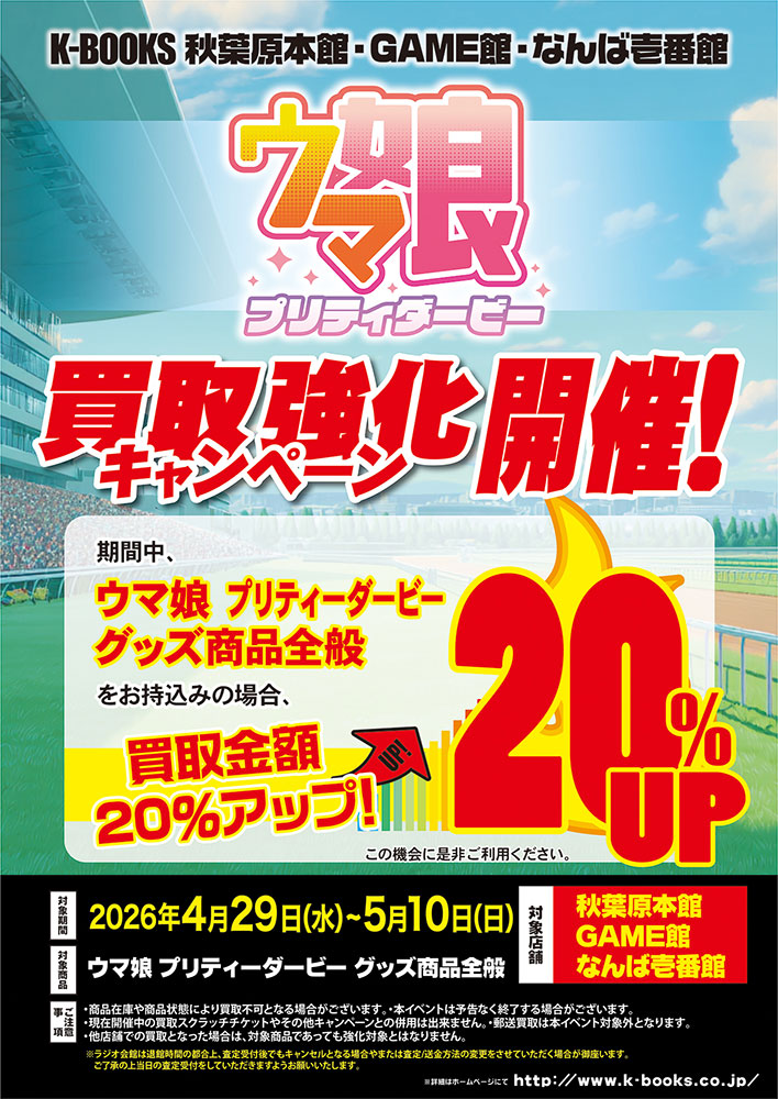 期間中「ウマ娘 プリティーダービーのグッズ商品」をお持込みの場合、買取金額を20%UPさせていただきます。