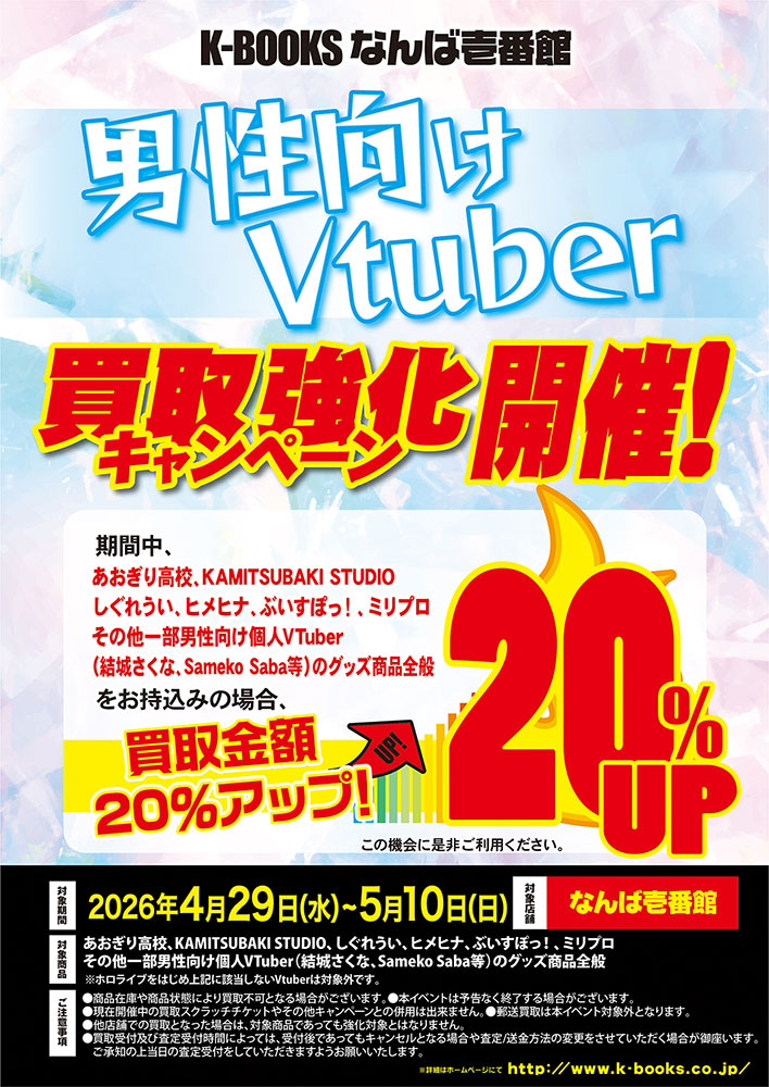 期間中、対象Vtuberの商品をお持込みの場合、対象商品の買取金額を20%UPさせていただきます。