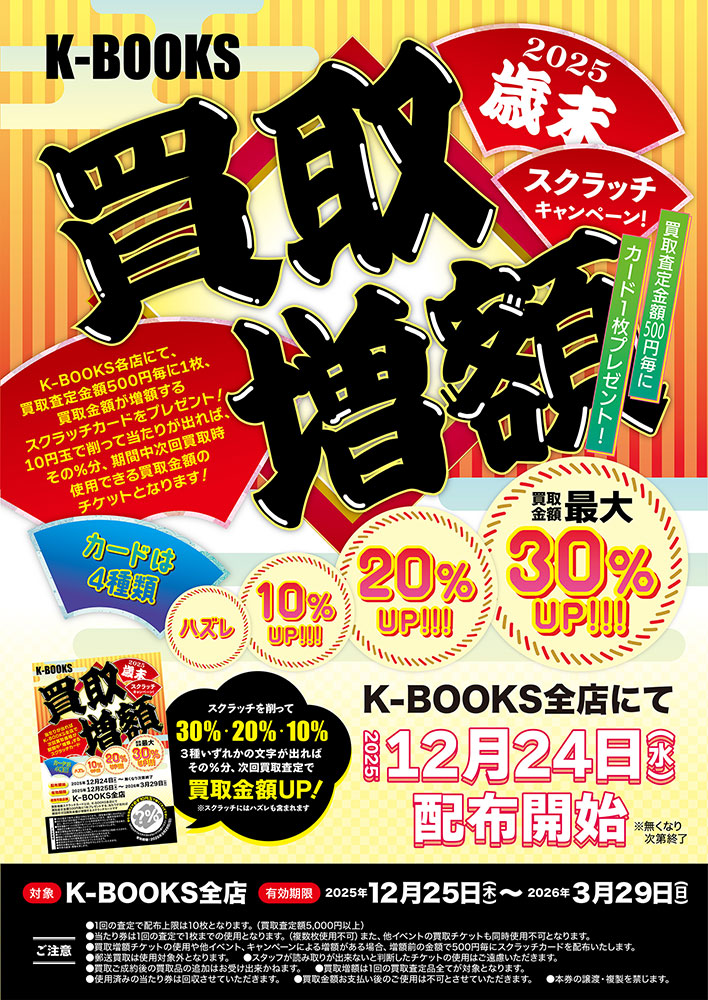 期間中K-BOOKS各店にて、期間中買取査定金額500円毎に、買取金額が増額するスクラッチカードを1枚プレゼント!